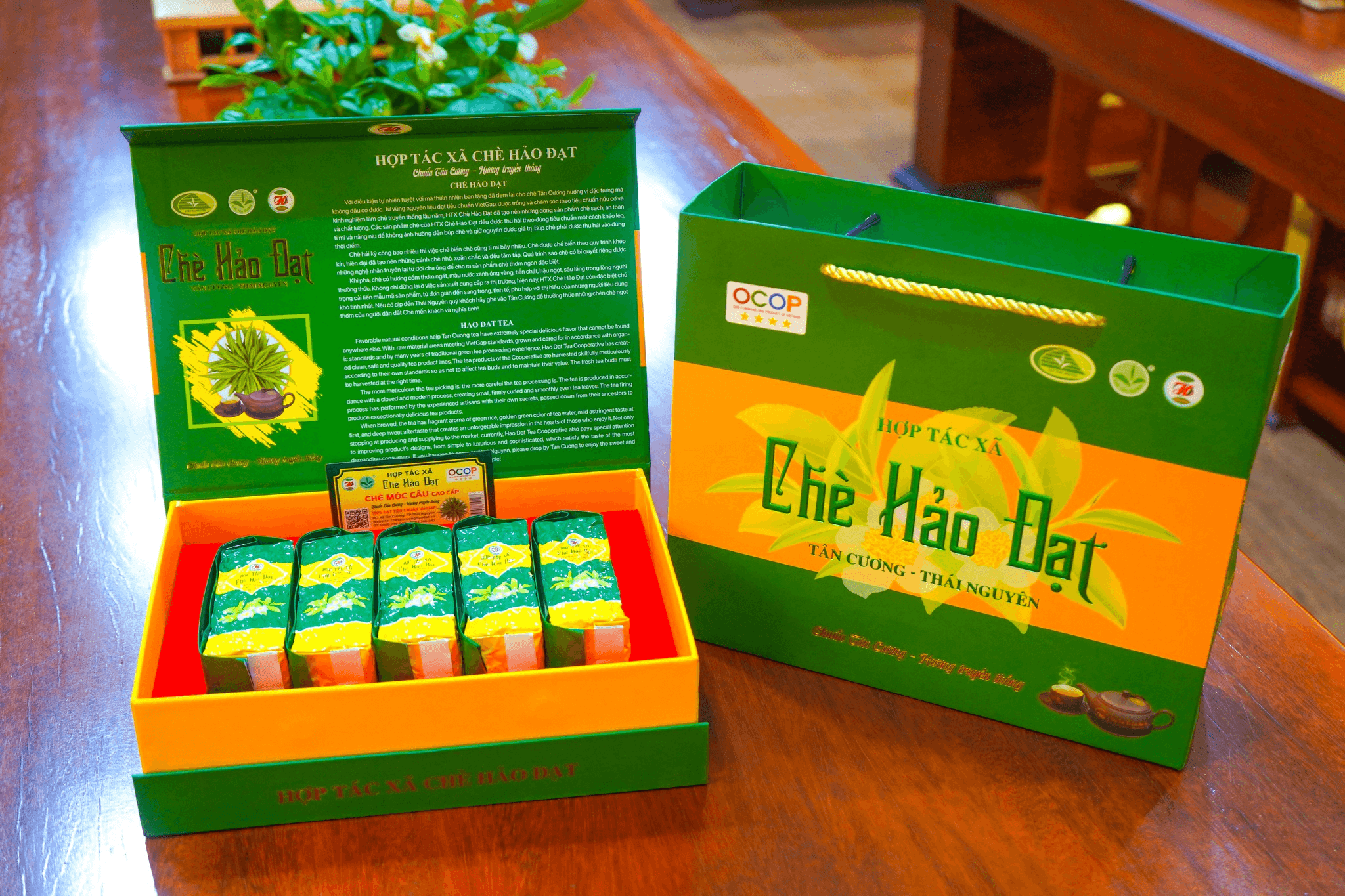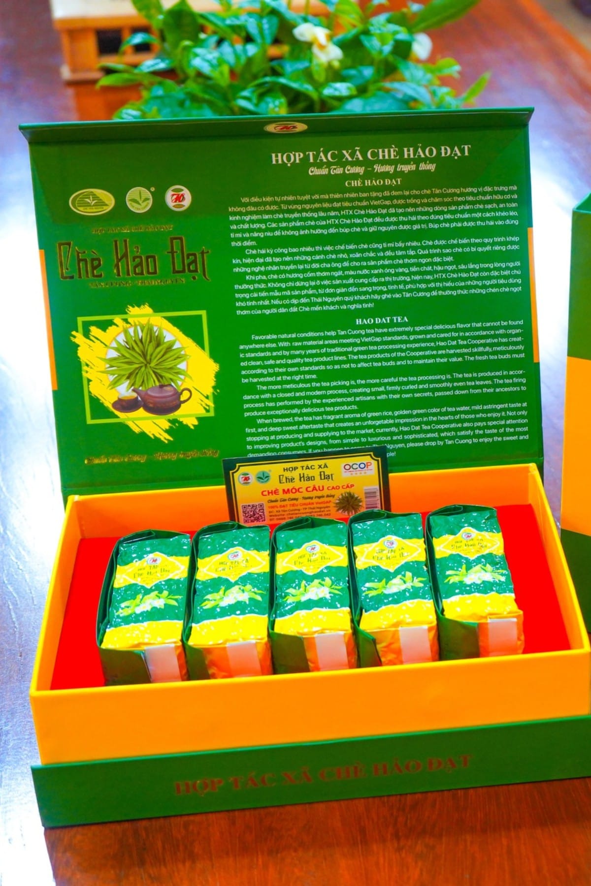 Không chỉ dừng lại ở việc sản xuất cung cấp ra thị trường , HTX Chè Hảo Đạt còn đặc biệt chú trọng cải tiến mẫu mã sản phẩm. Hộp trà Móc Câu với tông màu xanh chủ đạo cùng với chất liệu bìa carton lạnh cứng cáp và phủ giấy Couche tinh xảo, kết hợp ép nhũ vàng hai mặt chữ tạo điểm nhấn làm tôn nên vẻ đẹp sang trọng, ấm cúng và lịch thiệp. Bên trong được bọc kín bằng lớp mút xốp đỏ để giữ chắc chắn bên trong. Nắp hộp năm châm tiện lợi, giúp người dùng dễ dàng lấy và thưởng thức hương vị thơm ngon của trà. Hộp trà Móc Câu bên trong có 5 gói nhỏ trọng lượng 100gam được hút chân không và dán tem check mã vạch của sản phẩm, là lựa chọn hoàn hảo để biếu tặng những người thân yêu, bạn bè, đối tác trong những dịp đặc biệt, thể hiện sự trân trọng và đẳng cấp.